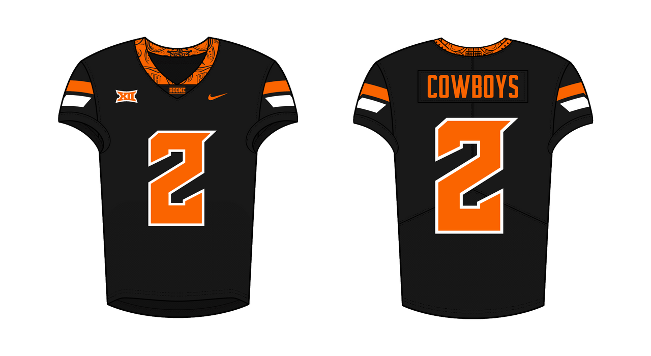 The updated Oklahoma State uniforms blend classic elements with a modern touch across all sports. For football, the pointed stripes and helmet design return, with a barbed wire detail and the OSU logo on both sides. The sleeves bring back the 2011 stripes, while the pants feature matching stripes. Hockey adopts similar sleeve stripes and a solid hem stripe, with black and white helmets and bandana-patterned collars. Baseball uses v-neck jerseys with a bat logo, and all pants come in orange, black, or white with matching stripes. Basketball keeps things simple with a bandana-patterned collar, “COWBOYS” across the jerseys, and notched stripes on the shorts. The design ties everything together, balancing tradition and modern style.