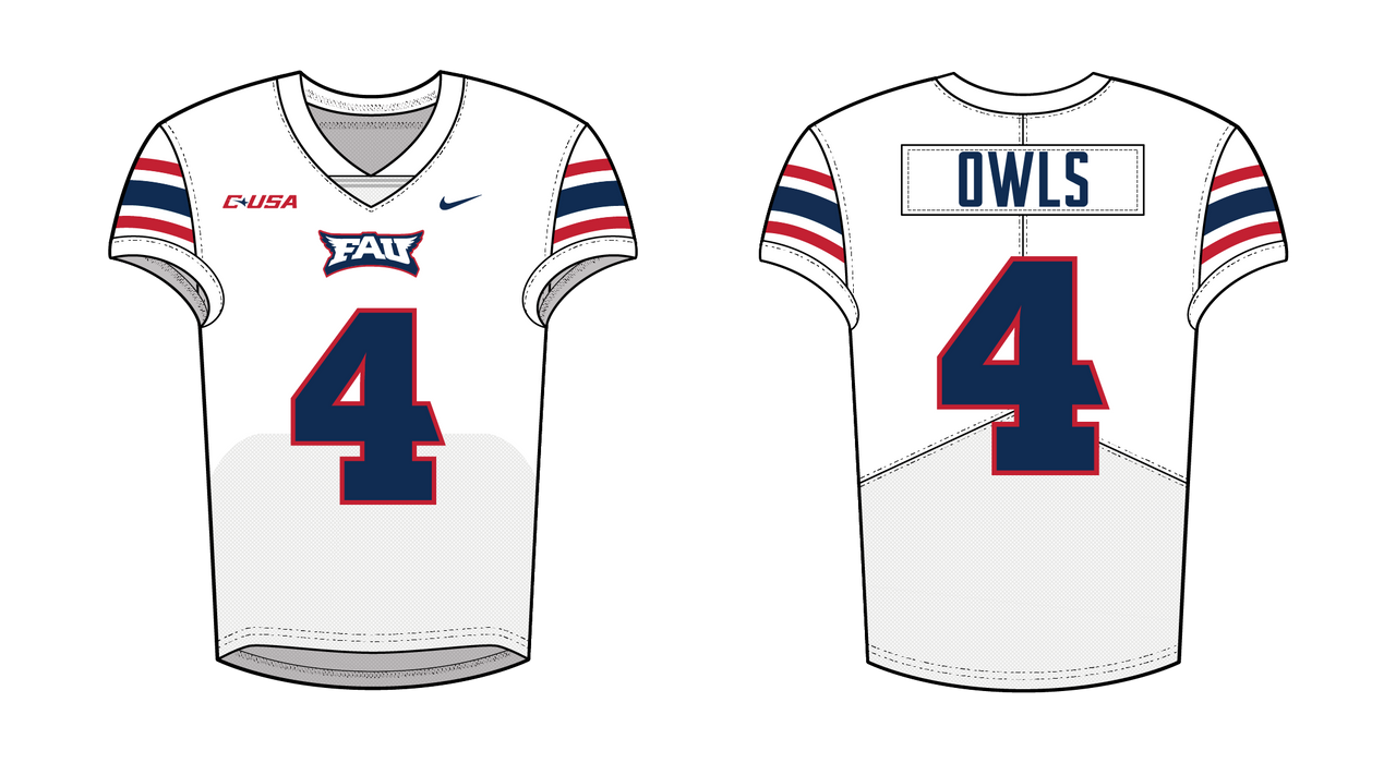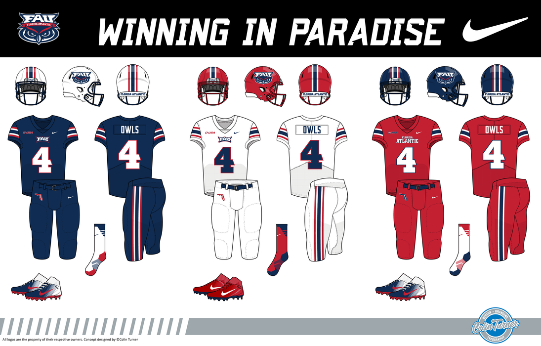 Back to the basics for the Owls. I wanted a nice and simple yet consistent design across the board in this redesign. Football keeps white, navy, and red helmets with the Owl Eyes logo and a consistent stripe. Jersey stripes move to the sleeves, with “FAU” on home and away sets and “Florida Atlantic” on the alternate. Pants feature a stripe and state outline, while red socks and shoes remain key. Hockey mirrors this with structured sleeve and hem stripes, the interlocking FAU on the shoulders, and interchangeable helmets and pants. Baseball refines its White Sox-inspired look with bold sleeve stripes, arched wordmarks, and three hats matching football’s scheme. Basketball follows suit, integrating the program-wide stripe and an Owl Eyes logo on the shorts.