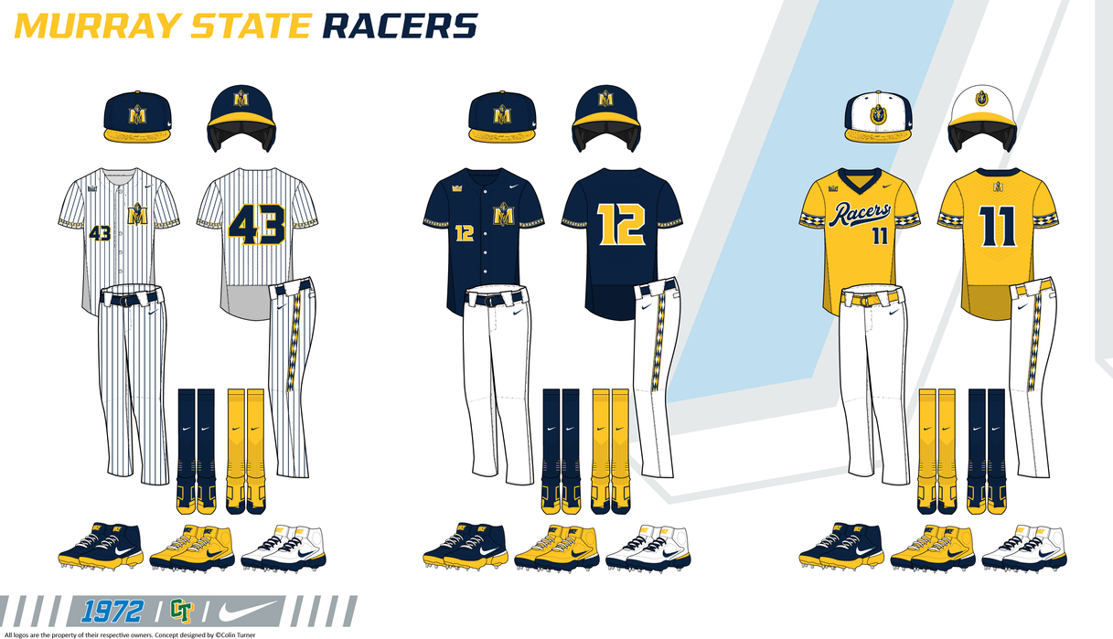 Murray State’s football uniforms feature the revived 2018 diamond stripe, with navy/white helmets and matching pants. Hockey uses classic stripes with a Canucks-inspired alternate. Baseball keeps pinstripes and adds diamond stripes on sleeves, with a gold alternate. Basketball incorporates Ja Morant's underarm stripes and diamond pattern, with the alternate logo on the shorts.