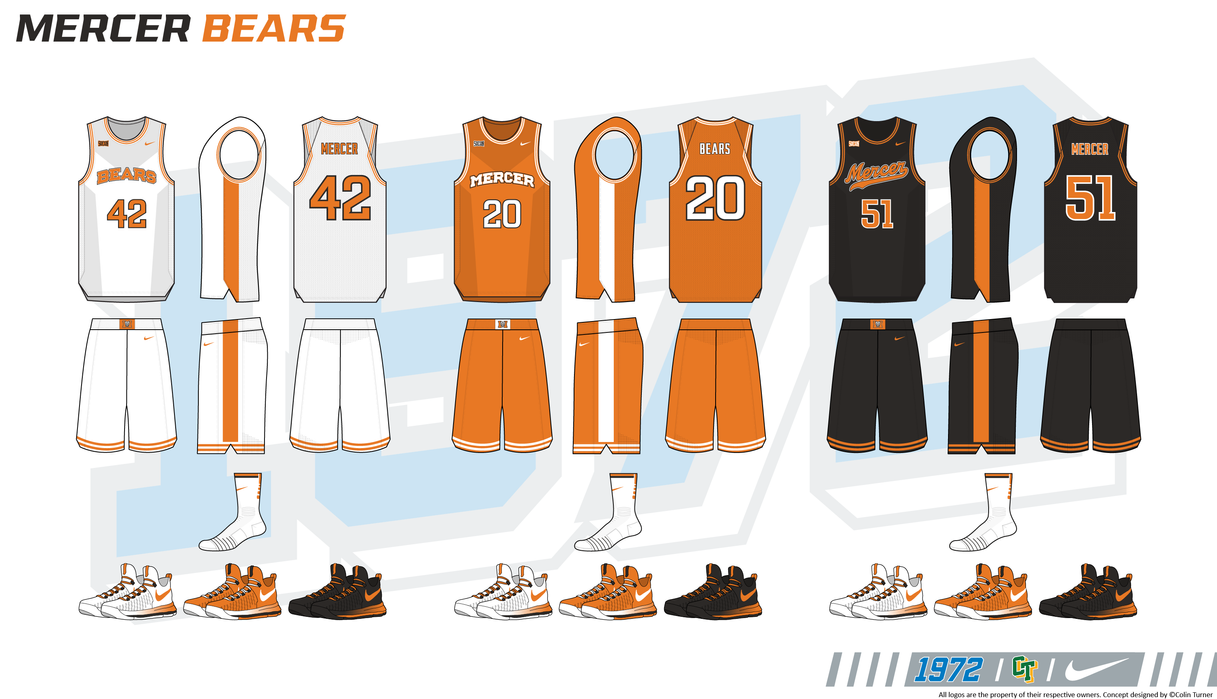 Mercer leans into a unified, stripe-driven look across all four sports. Football keeps white and black helmets with shortened double stripes, swaps Colts-style sleeves for racing stripes, and updates fonts and wordmarks. Pants match the helmet striping. Hockey adopts a clean Maple Leafs-style set with the M-Bear on the main kits, a roundel on the alt, and white helmets/orange pants as primaries with an all-black third. Baseball is the backbone: racing stripes blended with classic doubles, Mercer script on home/away, Bears on the alt, and MU-focused caps in orange/white, white-panel, and black. Basketball mirrors baseball with double-stripe trim, a simple side stripe, rotating BEARS/MERCER/script wordmarks, and the M-Bear on the waistband.