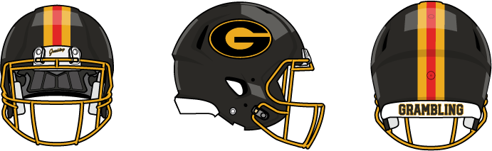 Grambling State leans into its classic identity with light modern updates. Football keeps a single helmet design with optional facemask colors, adds subtle tiger-stripe shoulders inspired by the 2025 Bayou Classic, and pairs refined wordmarks with simple triple-stripe pants. Hockey follows suit with traditional striping, tiger-striped shoulder yokes, a modernized shoulder logo, and a Canadiens-style chest-stripe alternate, all atop straightforward black equipment. Baseball stays traditional at home with Yankees-style pinstripes, while the road and alt introduce larger stripes, tiger-pattern sleeves, and updated scripts, backed by pinstripe or solid pants and two brim-color hat options. Basketball rounds things out with classic trims, a soft tiger-stripe side panel, and Grambling State or script marks depending on the uniform