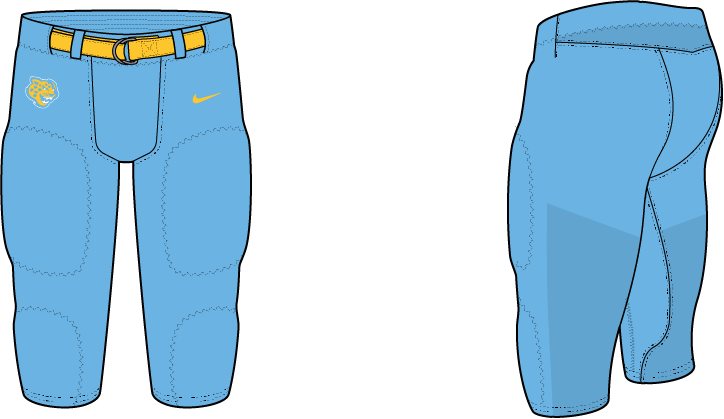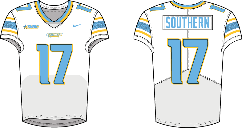 Southern leans into its vibrant light blue and gold with a unified “master stripe” identity across all sports. Football keeps the gold and white helmets with light blue facemasks and rotating SU and Jaguar marks, while evolving the sleeve stripe into a Florida-style stripe with a debossed jaguar pattern; new numbers sharpen the look, pants stay clean, and a navy-leaning alternate adds contrast. Hockey scales that stripe up in traditional placements with Jaguar and SU-Jaguar crest swaps, a yoke-accented alternate, and simple blue-and-gold equipment. Baseball mirrors the sleeve stripe and updated scripts, adds double-striped pants, including blue options, and rotates blue-and-gold headwear, with a v-neck alternate using the Jaguars wordmark. Basketball carries the master stripe down the sides, fills gaps with double stripes, updates the wordmarks, and introduces an alternate that drops the side stripe for sublimated jaguar texture and bolder striping
